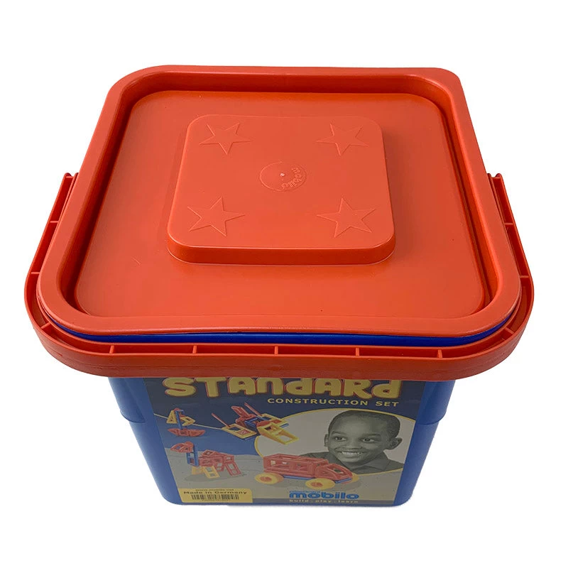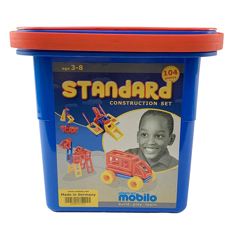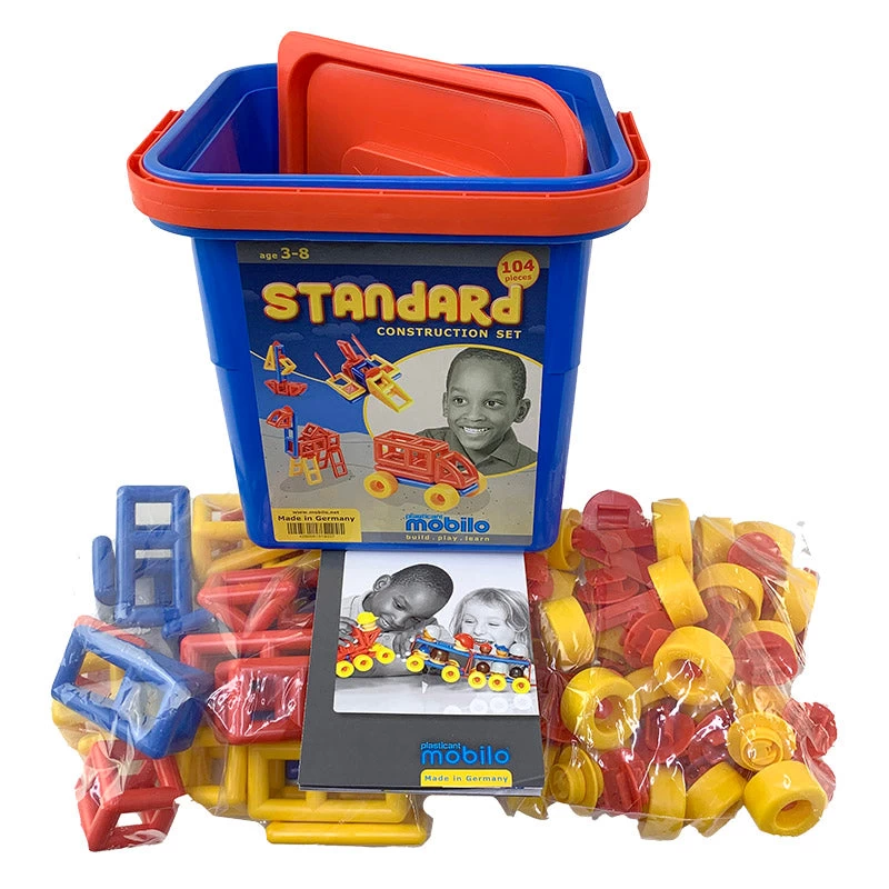 The Standard Bucket contains 104 pieces including 1 connector pack (78pc) and 1 geometric pack (26pc). The pieces come stored in a sturdy bucket with full instructions and construction possibilities.