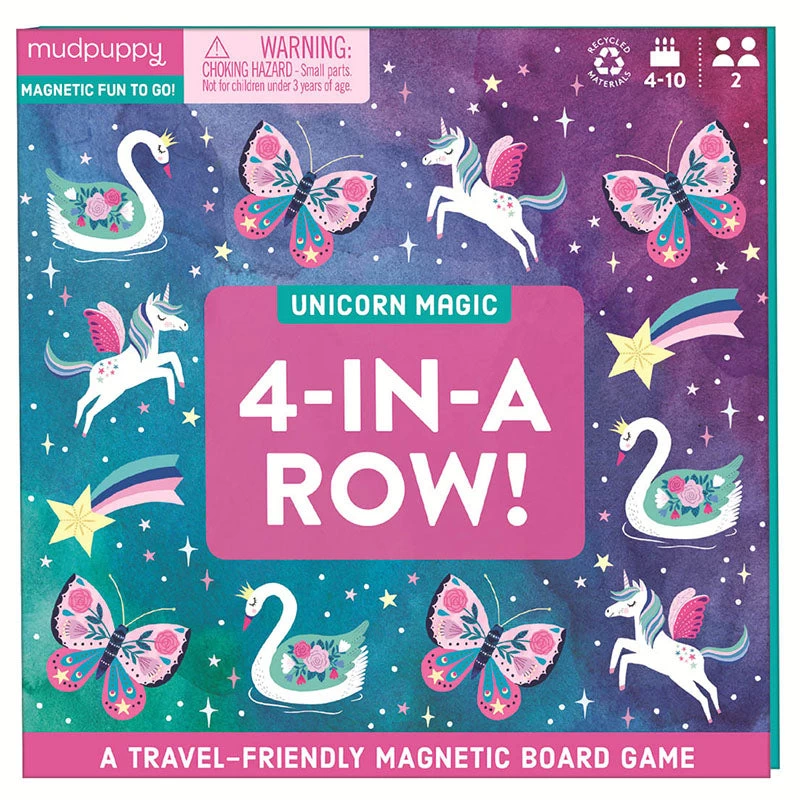 The Unicorn Magic 4-in-a-row Magnetic Board Game from Mudpuppy is a strategy game for 2 players and comes complete with butterflies, swans, shooting stars and unicorns.
