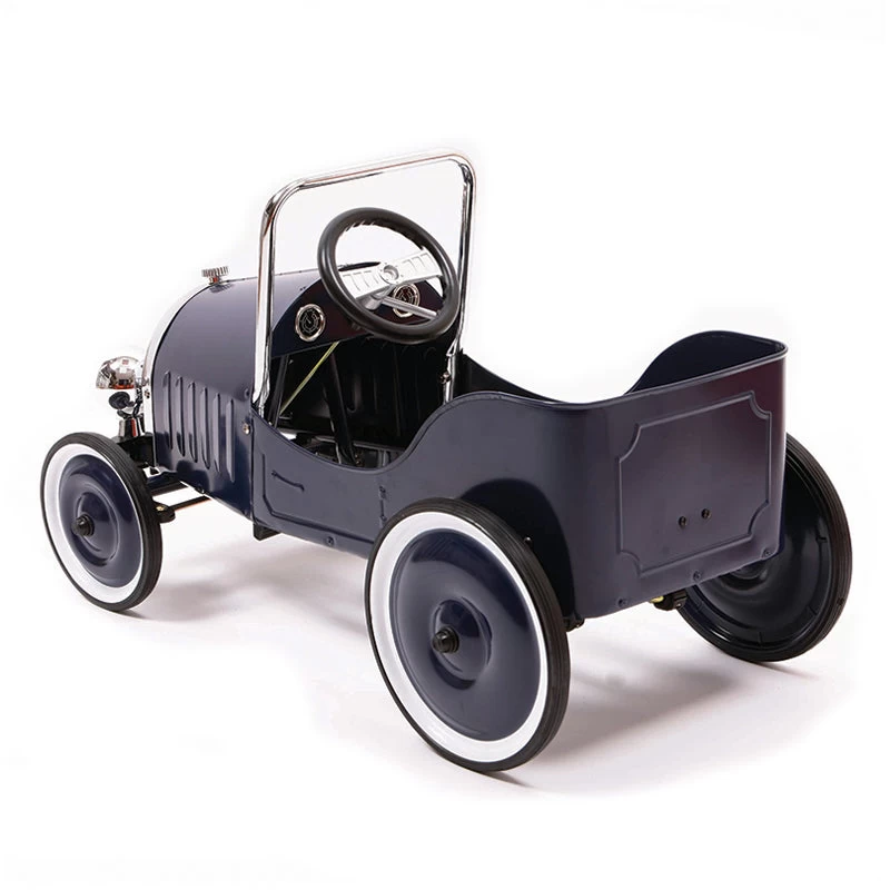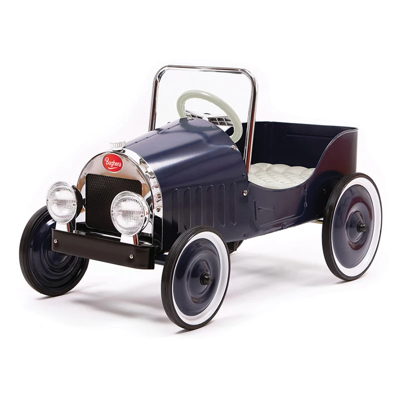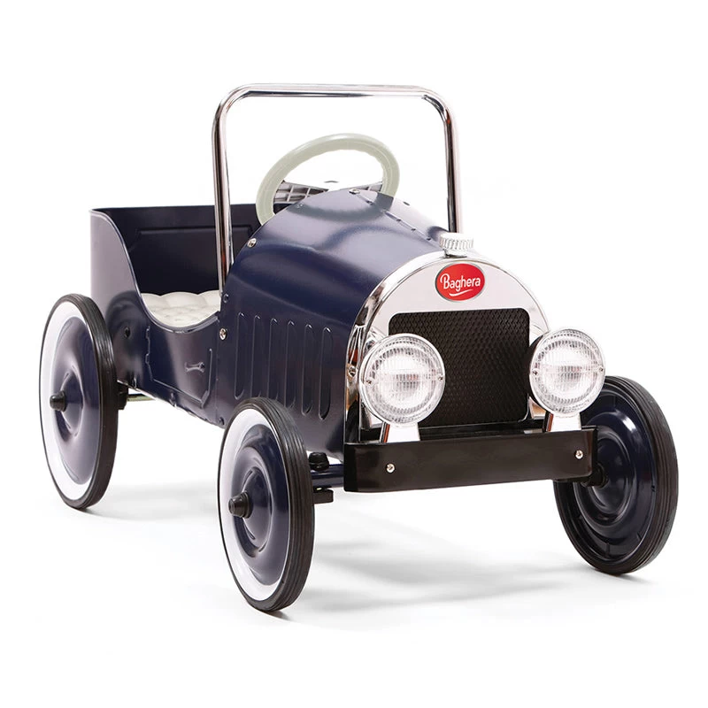 Inspired by the 30’s in a gorgeous retro style, this blue pedal car from Baghera has silver rims, a chrome grill, two large headlights and a windshield handle, perfectly equipped for any adventure.