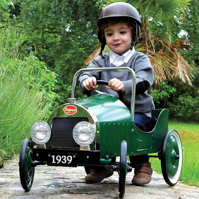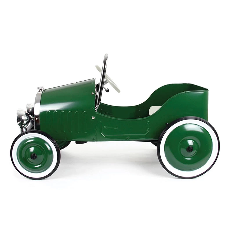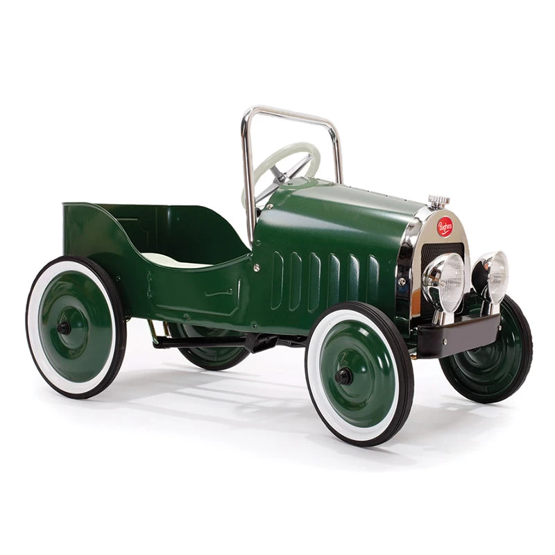 Inspired by the 30’s in a gorgeous retro style, this green pedal car from Baghera has silver rims, a chrome grill, two large headlights and a windshield handle, perfectly equipped for any adventure.