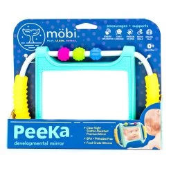 Peeka is a mirror that can lay flat, prop up on its stand or just be held. The shatter resistant mirror is encased in food grade silicone that is BPA and Pthalate free. Packed with developmental attributes which keeps baby’s attention.
