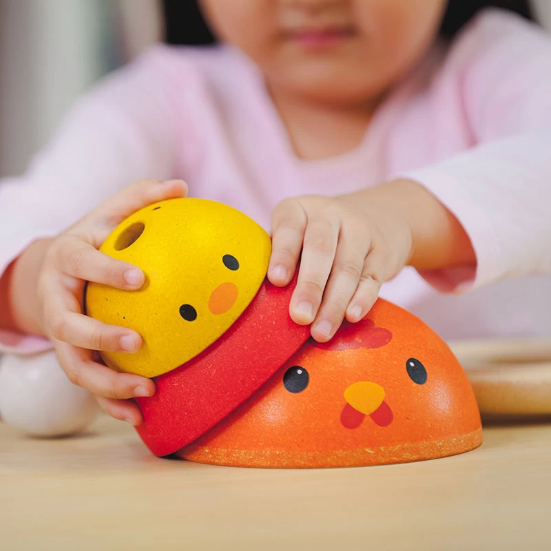 A fun Chicken Nesting stacker that little ones will love. A round base with three chicken pieces and an egg that can be stacked on top of each other in all sorts of funny ways. The half spheres have chickens painted on them and can be stacked or hidden within each other.