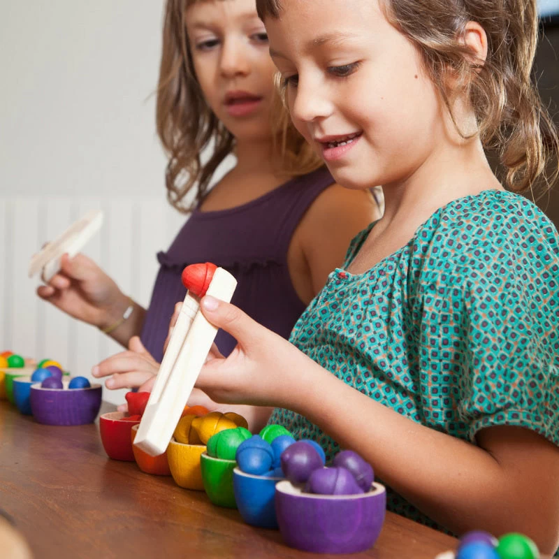 A charming set of 6 wooden bowls, one in each colour of the rainbow. Each bowl comes filled with 6 matching colour acorns – that’s 36 acorns total – will you match or mix them up? The set also includes a set of tongs to help move acorns from one bowl to another, ideal for dexterity training – perhaps an introduction to using chopsticks. Also a perfect play set for encouraging development in mathematics, logical thinking, colour identification, matching, sorting, and concentration.