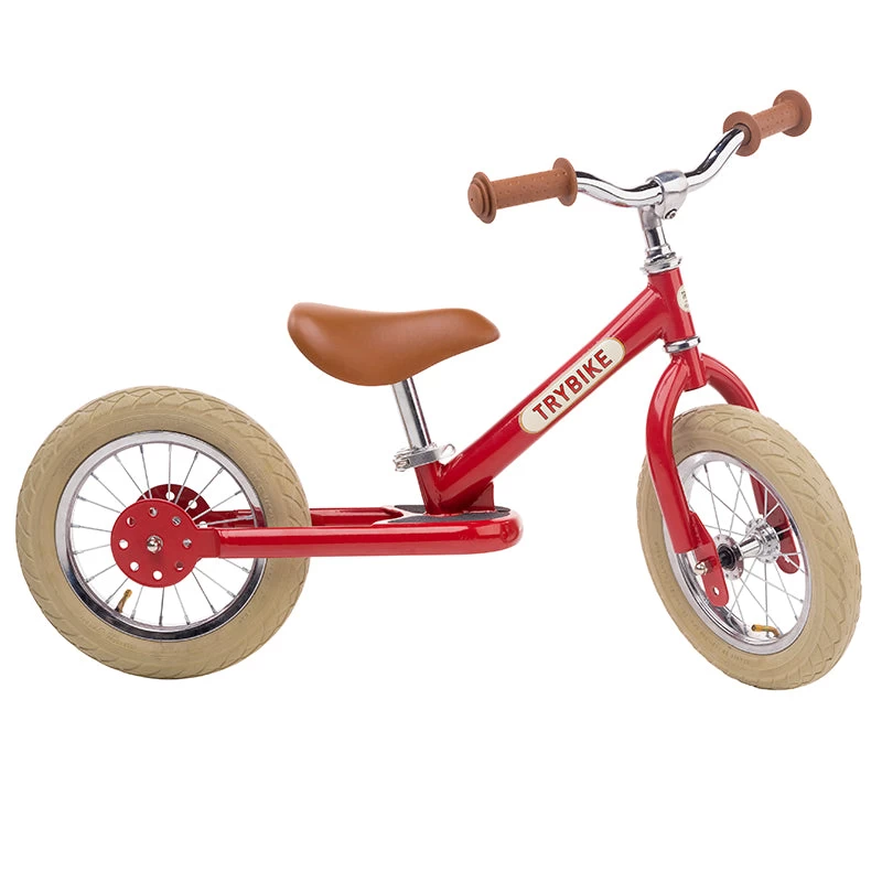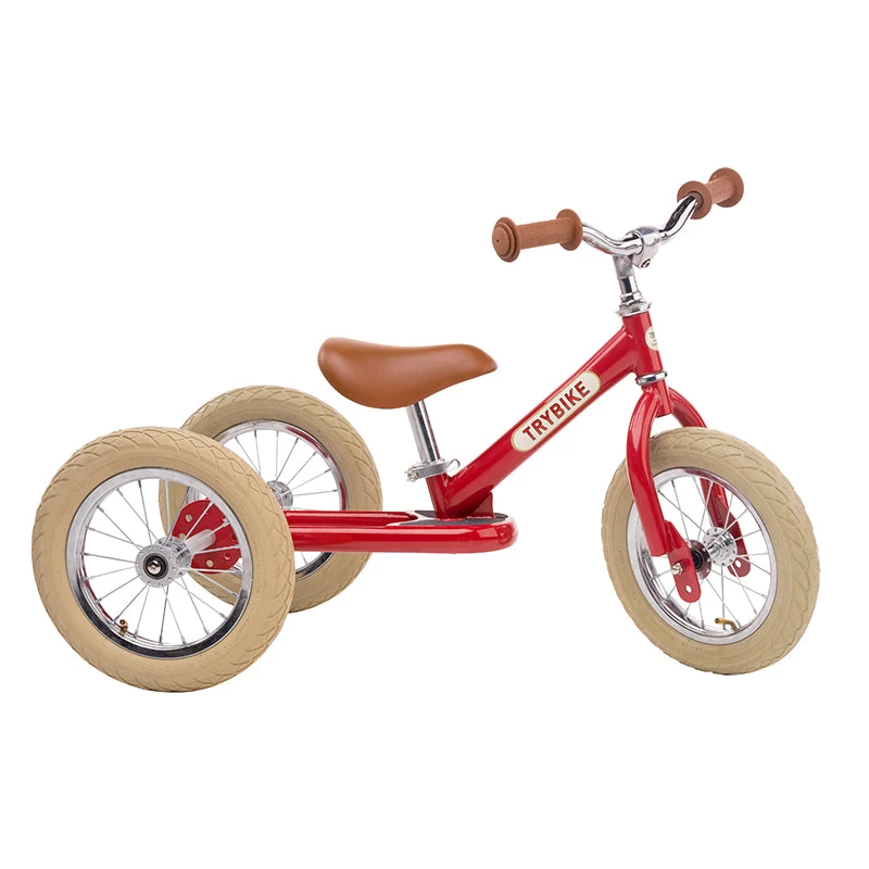 The Trybike’s new vintage steel 2-in-1 trike and balance bike is a seriously cool ride. The steel frame is coloured pink which looks fantastic against the bikes brown seat and handle covers, chrome accents and cream tyres. The bike easily transforms from a trike to a balance bike and the seat height is adjustable (30cm – 45cm). Maximum rider weight is 35kg.