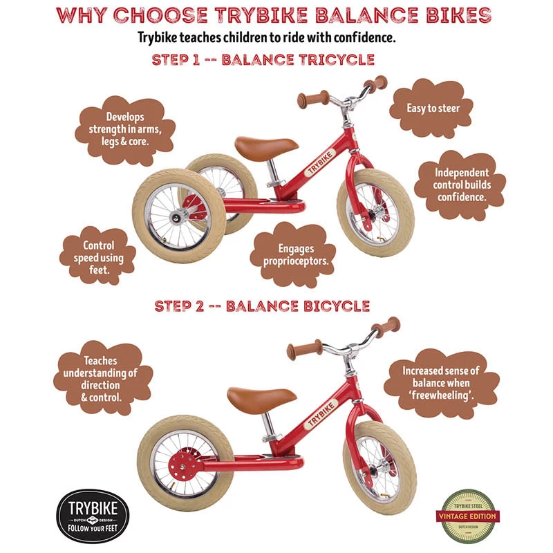 The wheels are 12-inch spoke steel with nylon bushings, sealed smooth with cartridge ball bearings and extra wide rubber inflatable tyres (for a smooth ride). There is no steering safety limiter so children have maximum manoeuvrability (great for smaller spaces). Each bike comes with a sticker sheet to customise your Trybike to your personal taste. The stickers are made of durable vinyl with UV laminate, making every sticker durable to rain, wind and sunlight.