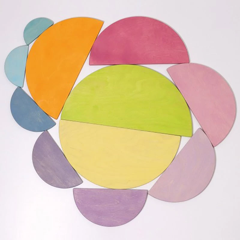 Little architects can experience flexibility and versatility in modern design and building with this pastel coloured semi-circle rainbow. The 11 pieces range in size and colour and are compatible with the Grimms Rainbows and Tunnels. Balance the semi-circles to create strange structures or create works of art with them on the floor – the possibilities are endless. The largest semi-circle is 37x18cm, the smallest semi-circle is 10x5cm.