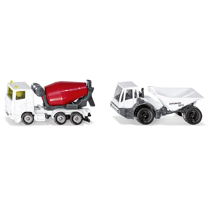 The Siku Construction includes two vehicles, a SIKU Cement mixer and a Bergmann dumper. A brilliant replica of the real thing. The vehicles can roll smoothly on the fully rotating wheels. Made almost entirely in diecast metal, making these toys tough and durable.