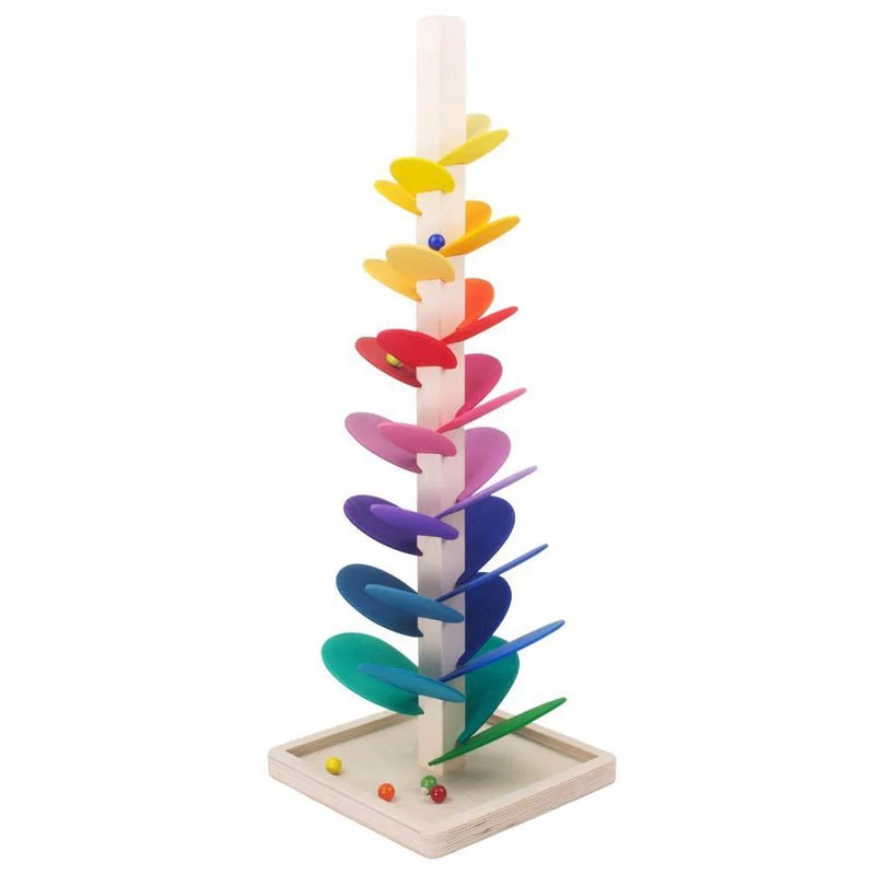 This gorgeous marble run sounding tree from Magic Wood is a delight to the eye. Drop a marble down the tree and watch it weave through the leaves one by one creating beautiful sounds as it falls. Comes with a set of 6 marbles. Great for developing hand-eye co-ordination. This beautiful tree is made in Poland from eco-friendly timbers, natural plant dyes and finished with flax seed oil. For long-lasting durability and playability, all pieces are sanded and finished with natural flax oil. Magic Wood harms no living trees to produce their range of wooden toys.