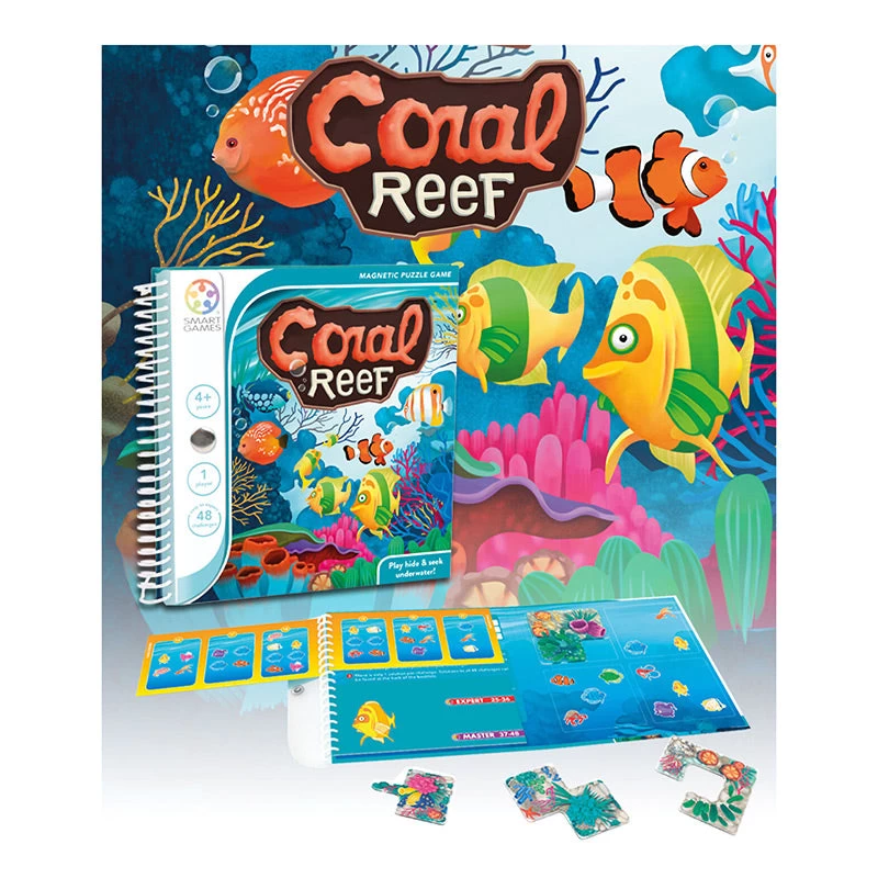 Take an underwater adventure with this coral reef magnetic travel game from Smart Games. Place all 4 pieces on the board so that only the challenge images are visible. A classic Hide & Seek concept with a new theme, this is a unique logic game with 48 different challenges from easy to extremely difficult.