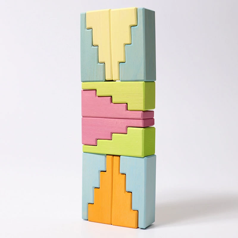 With the addition of the 12 stair elements, every building can be climbed. The pieces complement the colorful variety of construction and play materials. Using two stair elements to make the roof line, magical little worlds with fantastic architecture can be created.