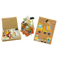 Keep your little one busy with the construction themed tap a shape playset. What designs can you create? Tap A Shape is a wonderful set that will help with creativity, imagination and fine motor skills. Simply hammer the nails through the holes on the wooden shape pieces to create your own masterpiece. The set comes with 1 x cork board, 1 wooden hammer, 57 wooden pieces, 80 nails and 4 pattern cards. The set is packed in a book shaped box which is ideal for storage and travelling.