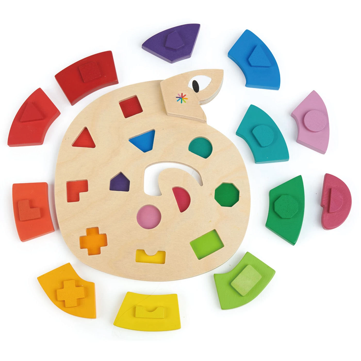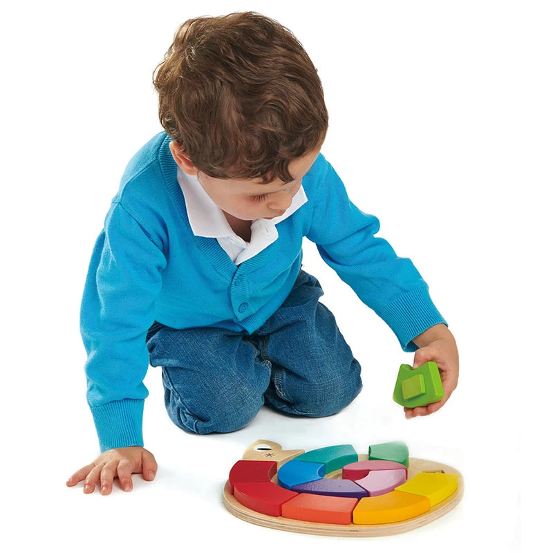 How much fun is this brightly coloured snake? A wonderful way to teach your little one about colours and shapes. Match the pieces with the shapes on the board to create your colourful happy worm. All the pieces are made from sustainable rubber wood and stained with bright colours.Â