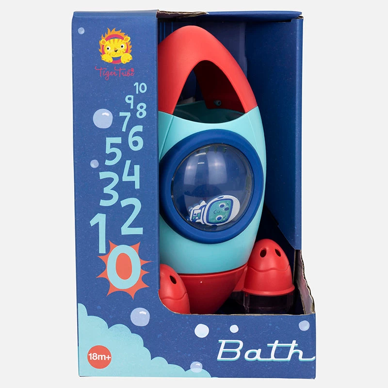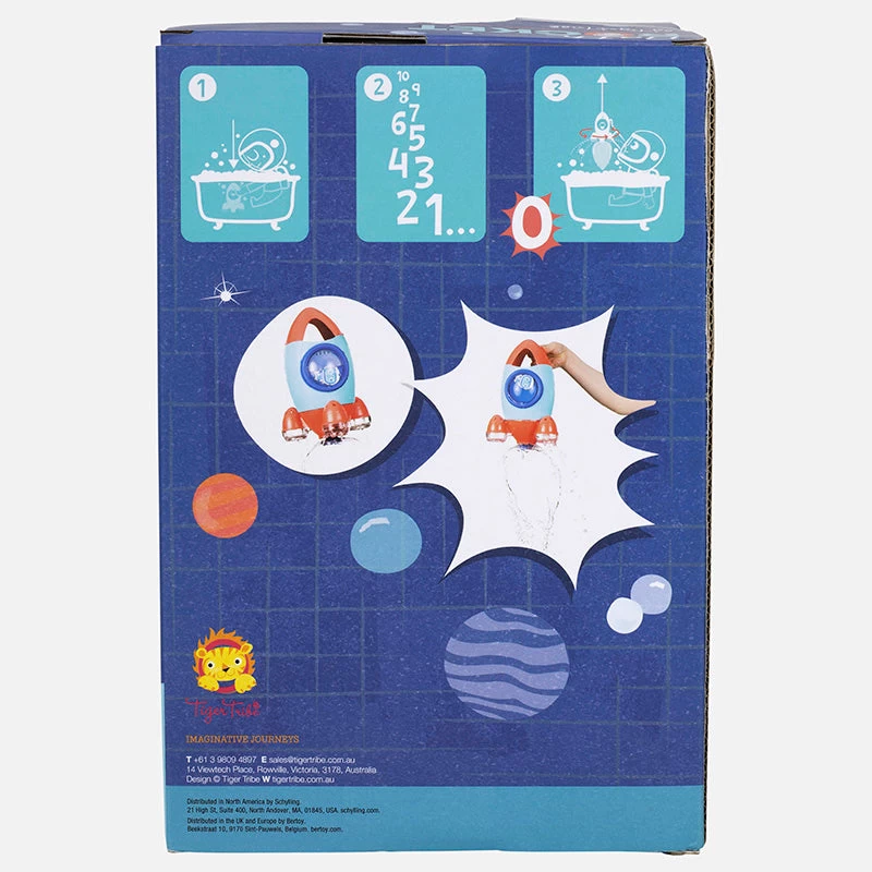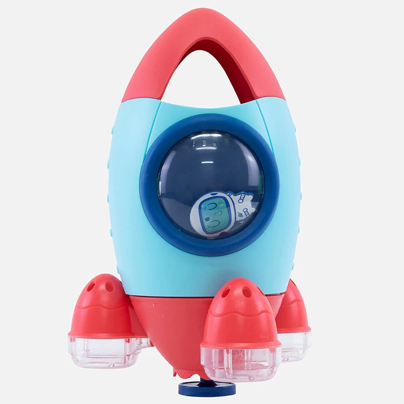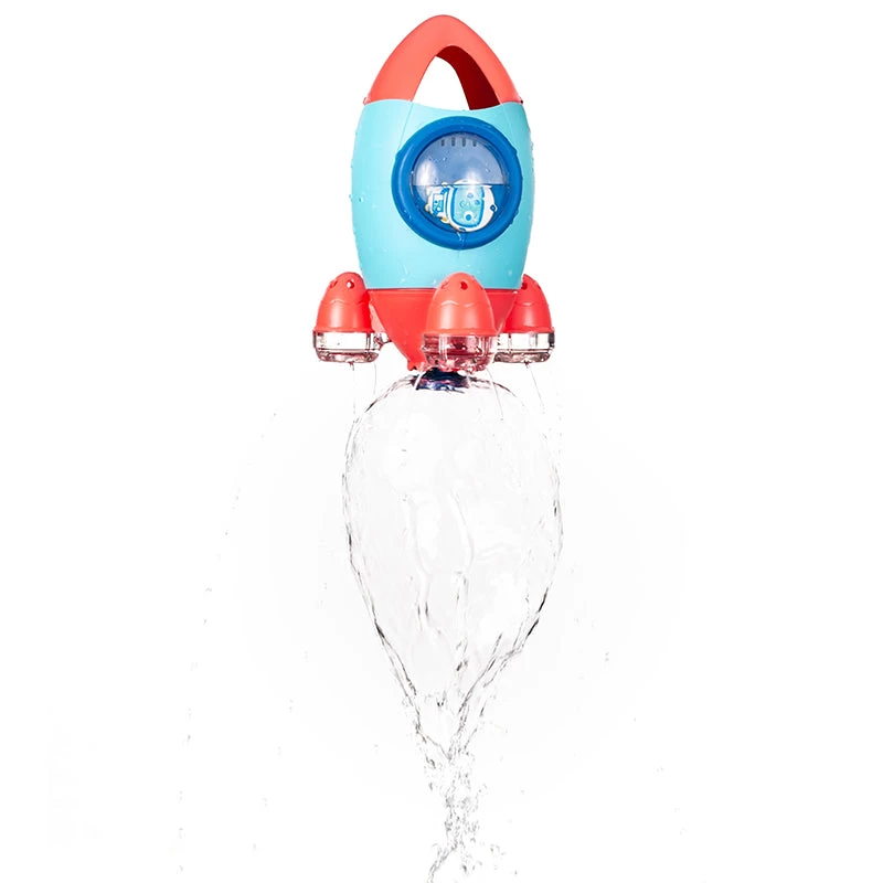 Dunk the rocket under water to fill it up, counting down from ten as the water level rises. Then 3-2-1 it’s blast off time! As the rocket launches, water rushes out, cascading from the spinning jets and creating a supersonic dome shape.