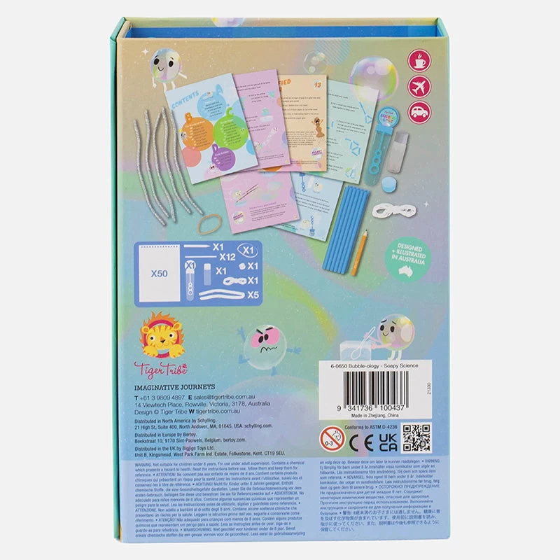 The Tiger Tribe Bubble-ology Soapy Science Activity Set provides 24 experiments intended to help children apply STEAM principals to the world around them. Bubble-ology enables junior scientists to build their very own bubble toolbox while they discover the science and art of making bubbles.