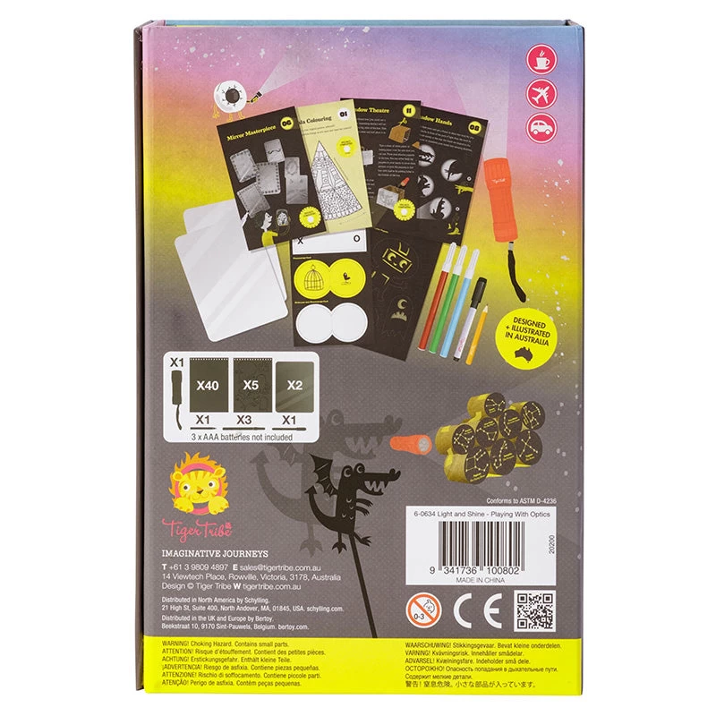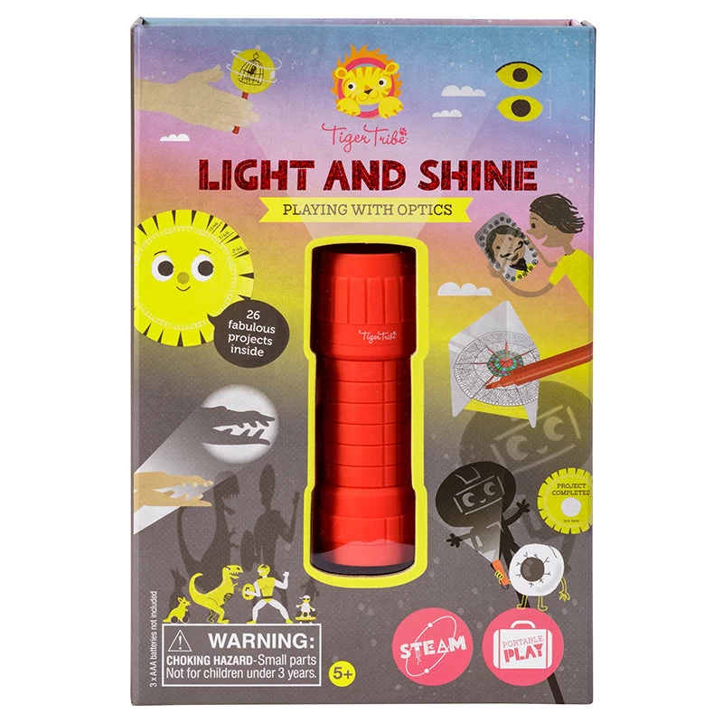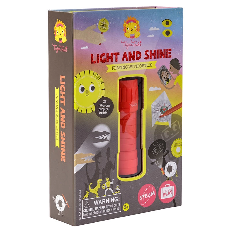 Discover light and eye sight with the Light and Shine Playing with Optics Activity Set from Tiger Tribe. The STEAM set includes 26 fun, hands-on optic experiments exploring the world of light, vision, shadows and reflections.