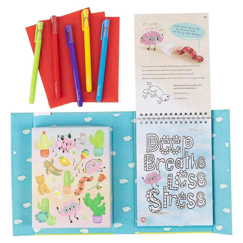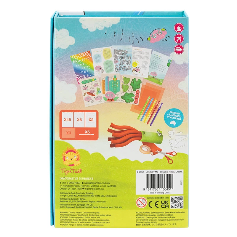 This set includes a 45 page mindfulness guide book, 5 coloured pencils, 3 sheets of red tissue paper, 5 pop out activity pages and 2 sticker sheets. All contents come in a box with a magnetic flap to keep contents safely stored.