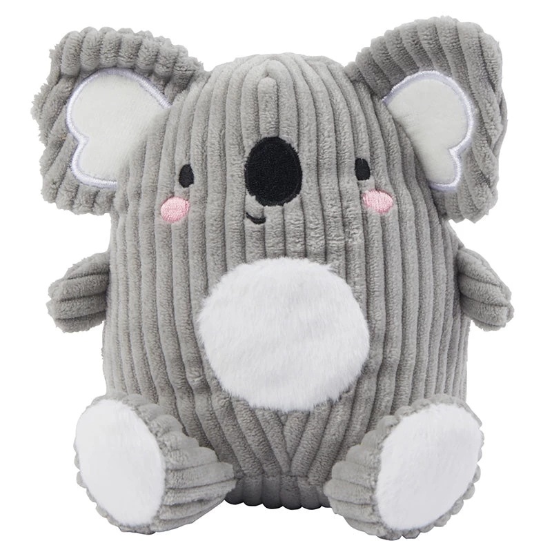 The koala is the ideal size for little ones to cuddle (17cm tall). It is made from a soft textural corduroy fabric, his ears crinkle, he has a black embroidered nose, his tummy is soft and furry and his body squeaks when shaken.