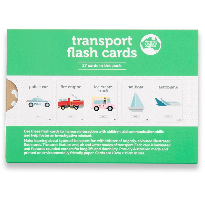 There are 27 cards in this pack displaying different transport modes – land, air and water. The cards are laminated and have rounded corners for durability and longevity.
