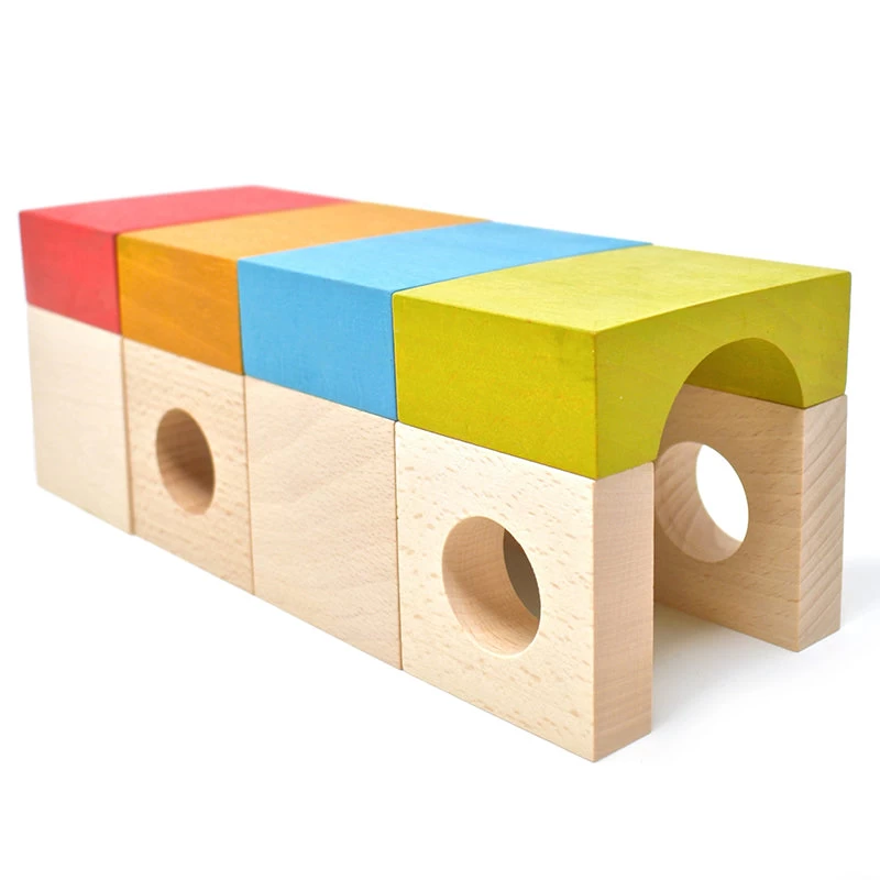 The Fontana Tunnel Blocks construction set comes with eight tunnel shaped blocks and 16 square wall pieces, all made of high quality solid beech wood. A perfect addition to any wooden railway set. The blocks can also be used to build structures like buildings, garages, bridges and more. The Fontana Double Pack includes unpainted natural wall pieces as well as tunnel shaped blocks in red, lime green, blue and ochre. The arches are approx 9cm x 6.5cm x 3cm and the are approx 6.5cm x 4.5cm x 6.5cm.