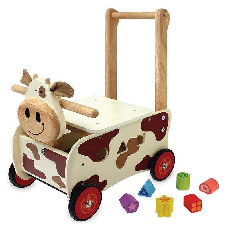The Walk and Ride Cow Sorter from I’m Toy is a sturdy walker with easy grip handle, shape sorting body, shape sorting blocks and handy storage under the removable seat!