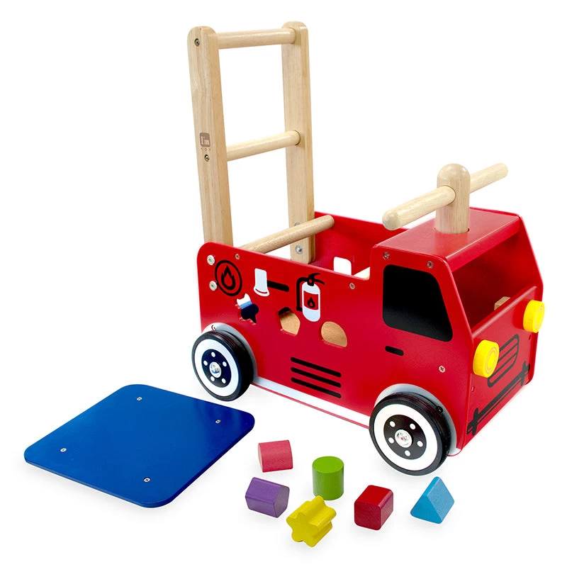 Help your little one build their confidence standing, walking or scooting! This bright red fire engine walk and ride sorter features an easy grip handle, shape sorting body, shape sorting blocks and a handy storage compartment.