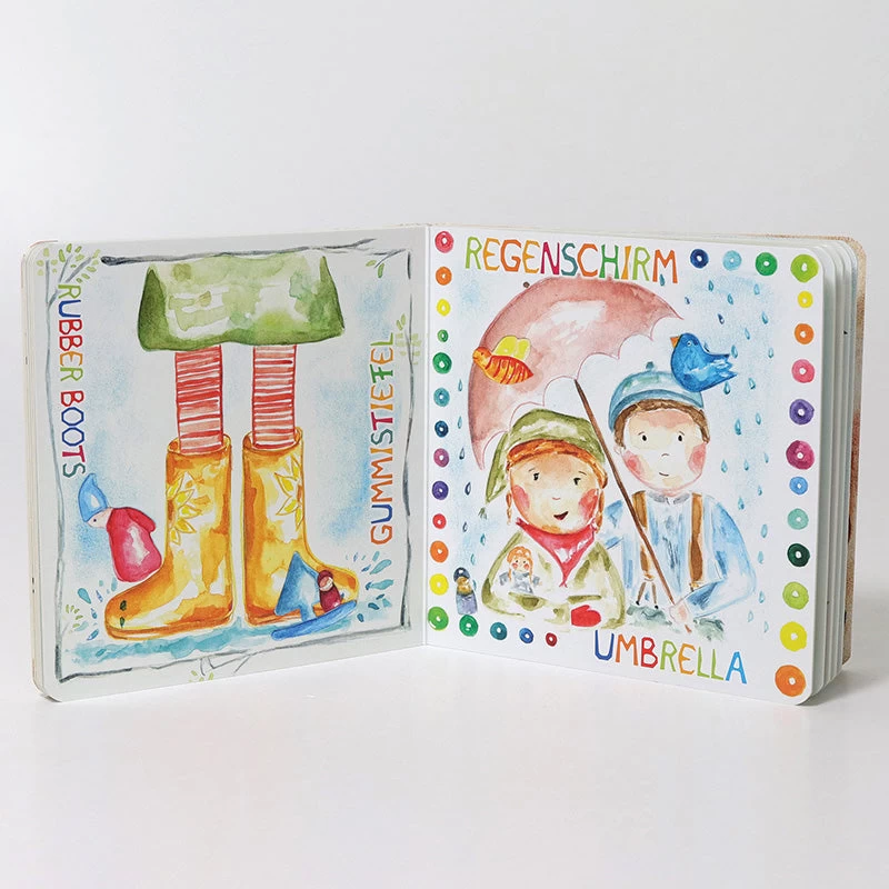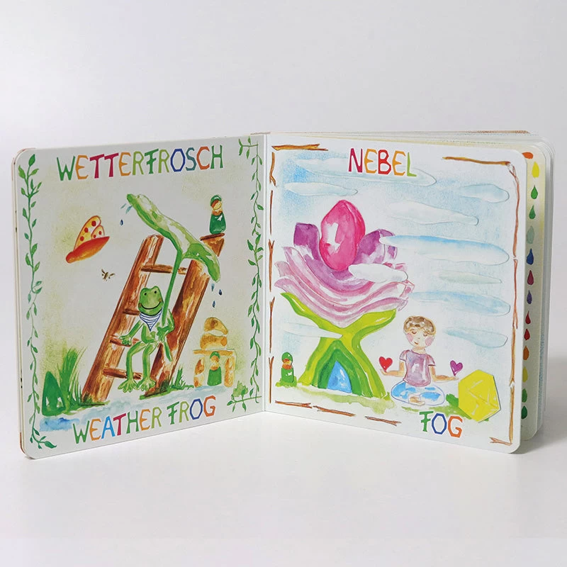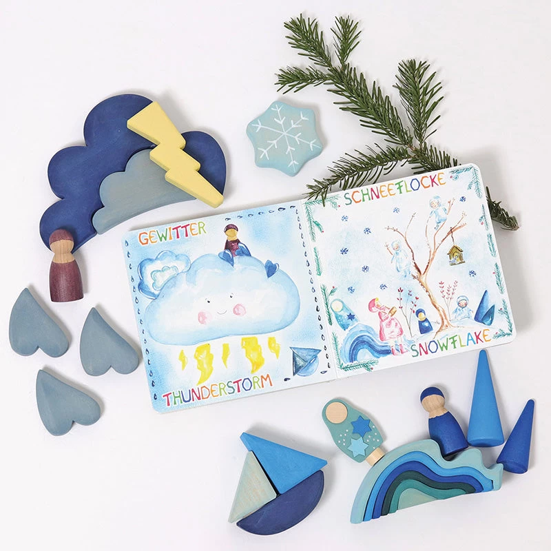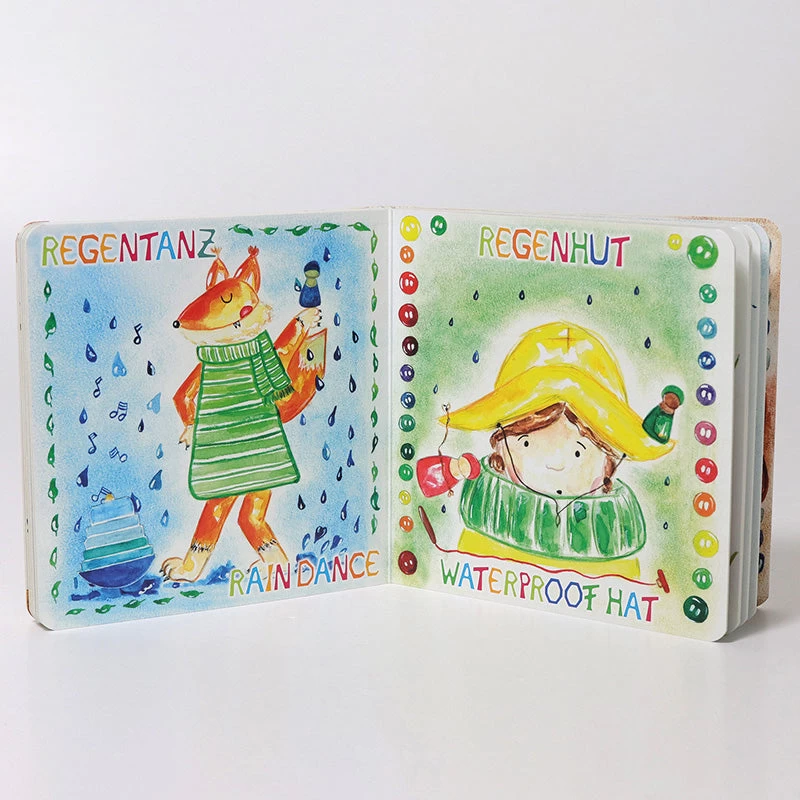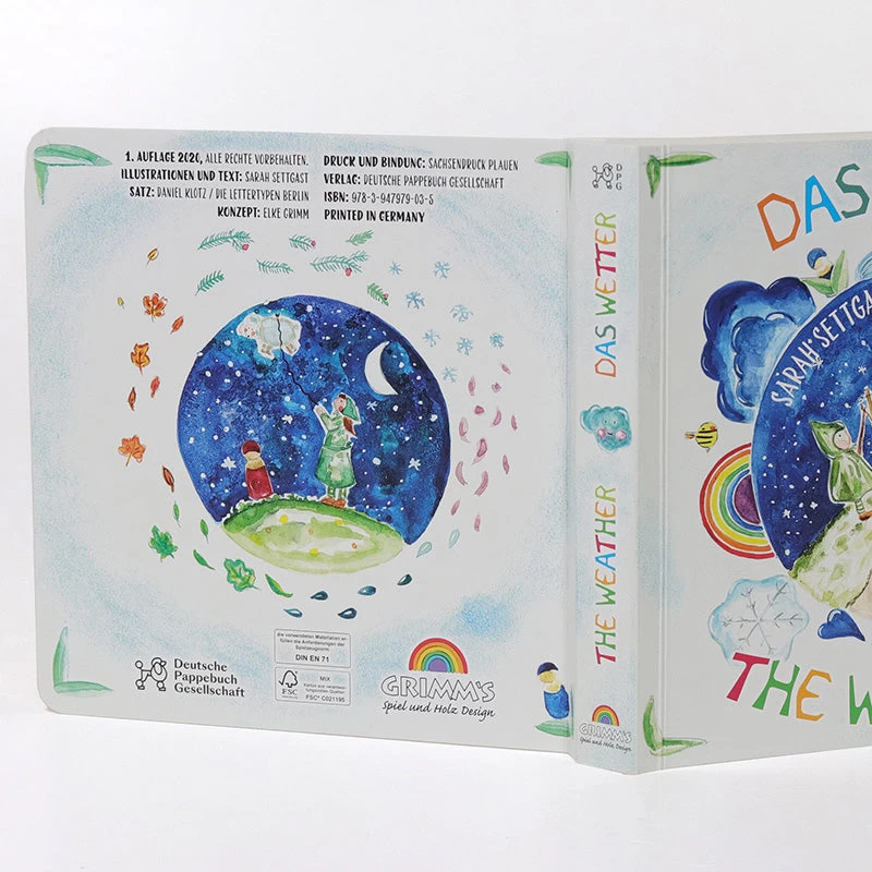 The Weather Book is the first ever Grimm’s book, created in collaboration with the German illustrator Sarah Settgast. The 26 page book uses 24 designed illustrations to tell stories about the weather and everything associated with it (for example fog, wind, storms, sun, sunset, rainbow, storms). An experience for the whole family and for all the senses! The book is bite and saliva proof and has rounded corners.