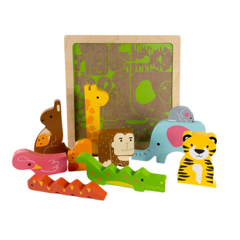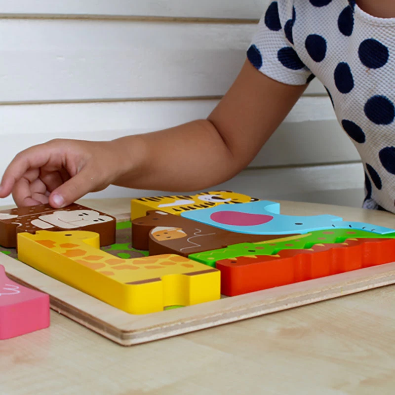 Chunky puzzles are a fun way for small children to improve their fine motor skills. This wild animal chunky puzzle from Kiddie Connect features ten animals that fit neatly into a wooden tray.