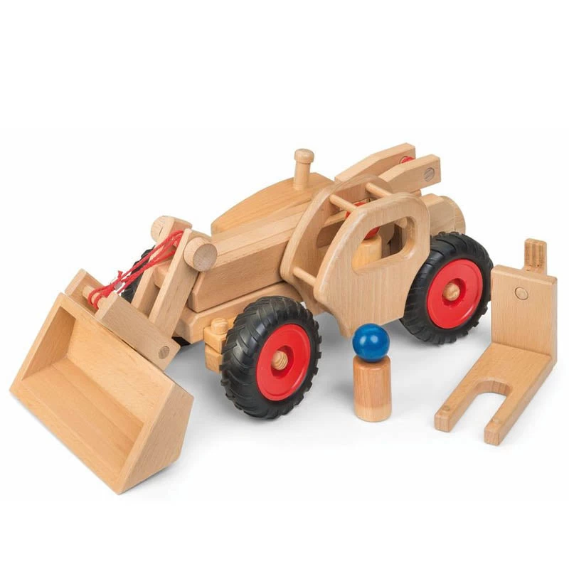 This Wooden Telescopic Loader by Fagus is a beautifully designed vehicle. It has fully steerable black and red rubber based wheels, an extendable height adjustable cantilever, a loading fork , 1 blade and 2 Fagus peg people.